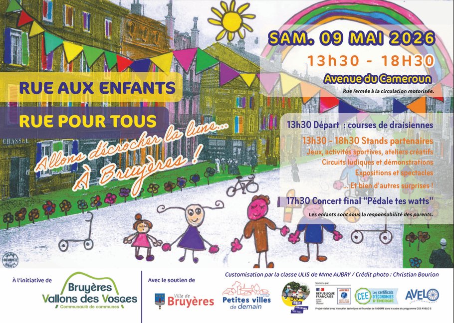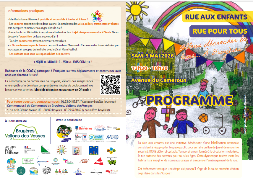 Pour la 1ère fois dans les Vosges, venez retrouver la manifestation "La Rue aux enfants" cette initiative bénéficie d’une labellisation nationale consistant à réapproprier l’espace public pour en faire un lieu de jeu et de rencontre sécurisé, 100% piéton et cyclable. Temporairement fermée à la circulation motorisée, la rue du Cameroun autorise des activités pour tous les âges. Tous Les renseignements sont à retrouver sur la pièce et le lien joints